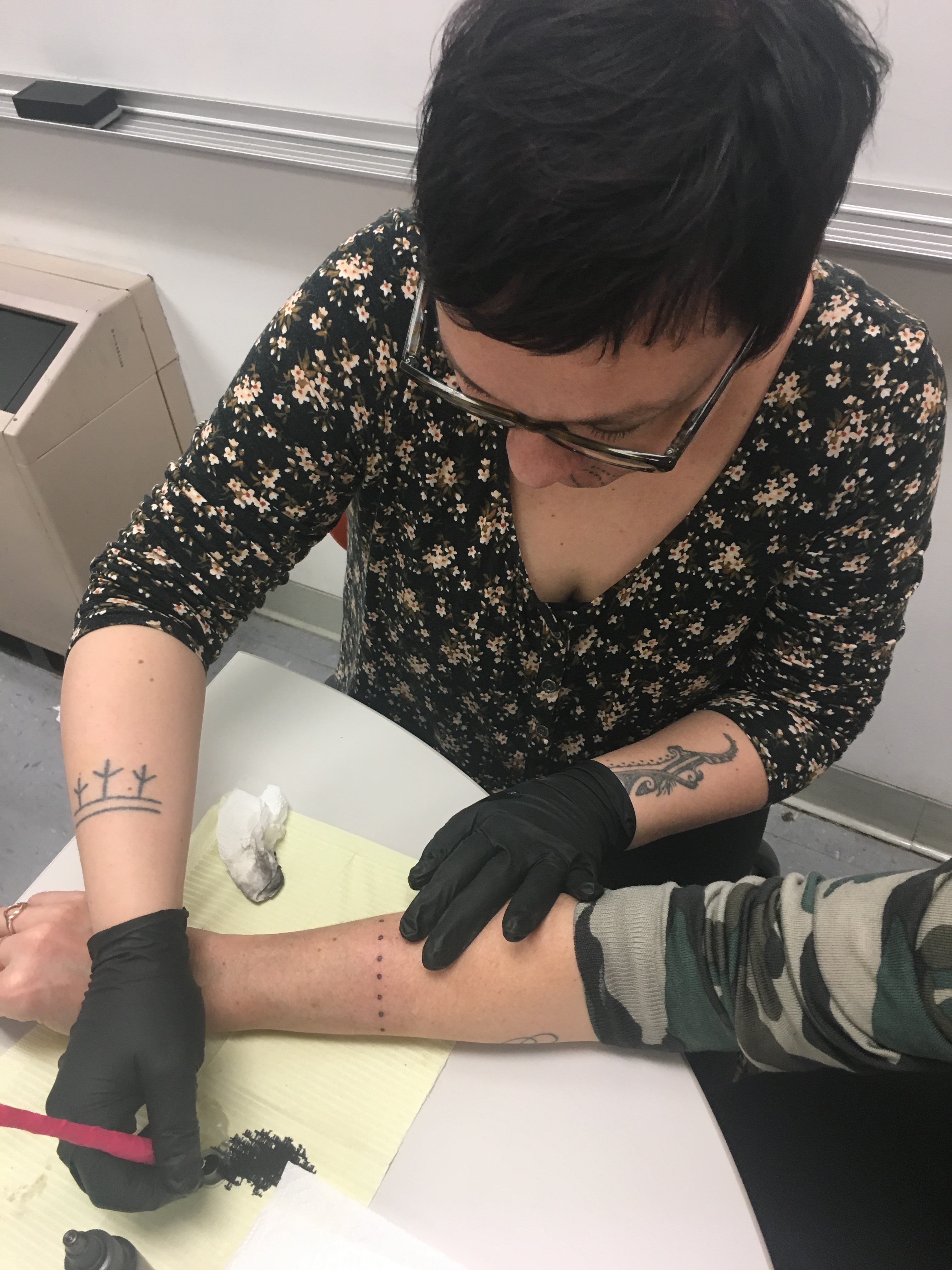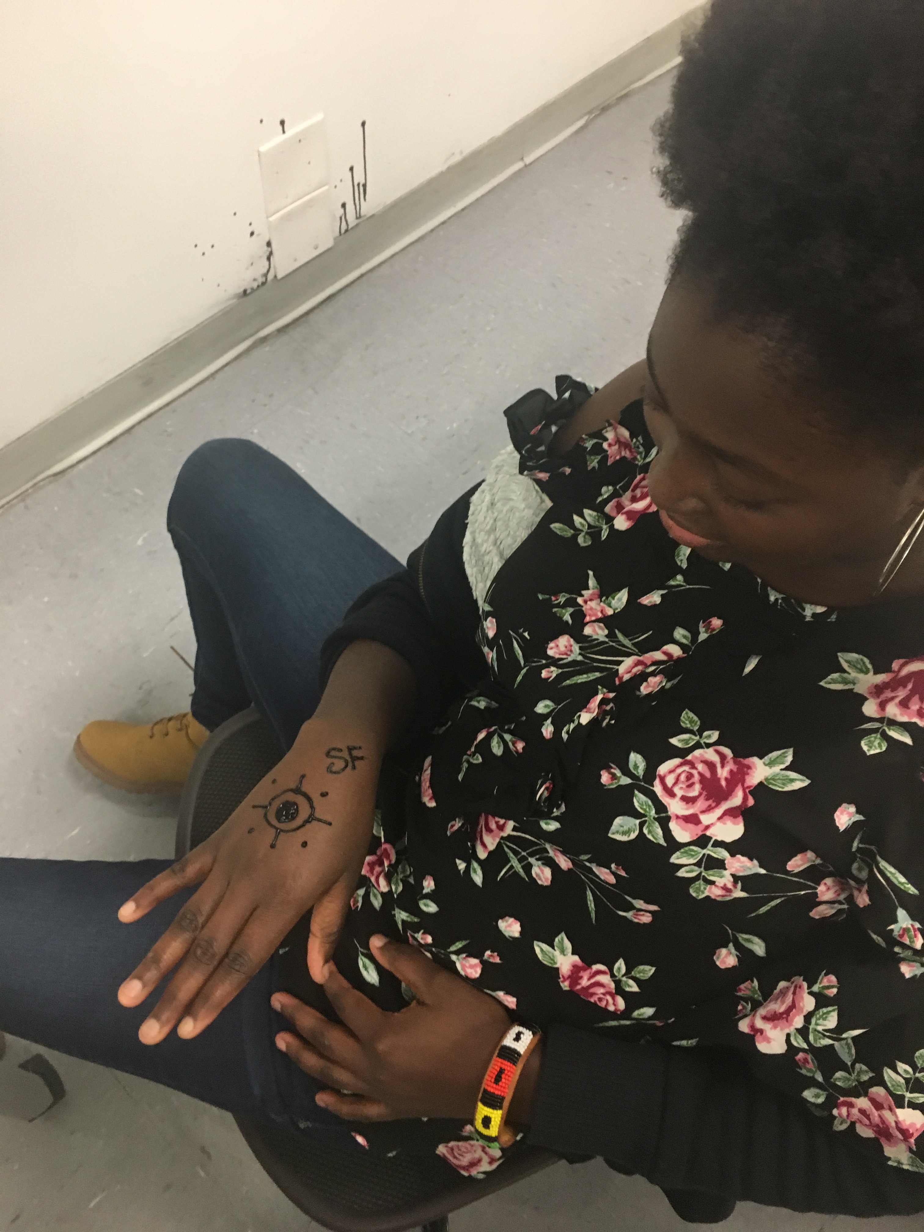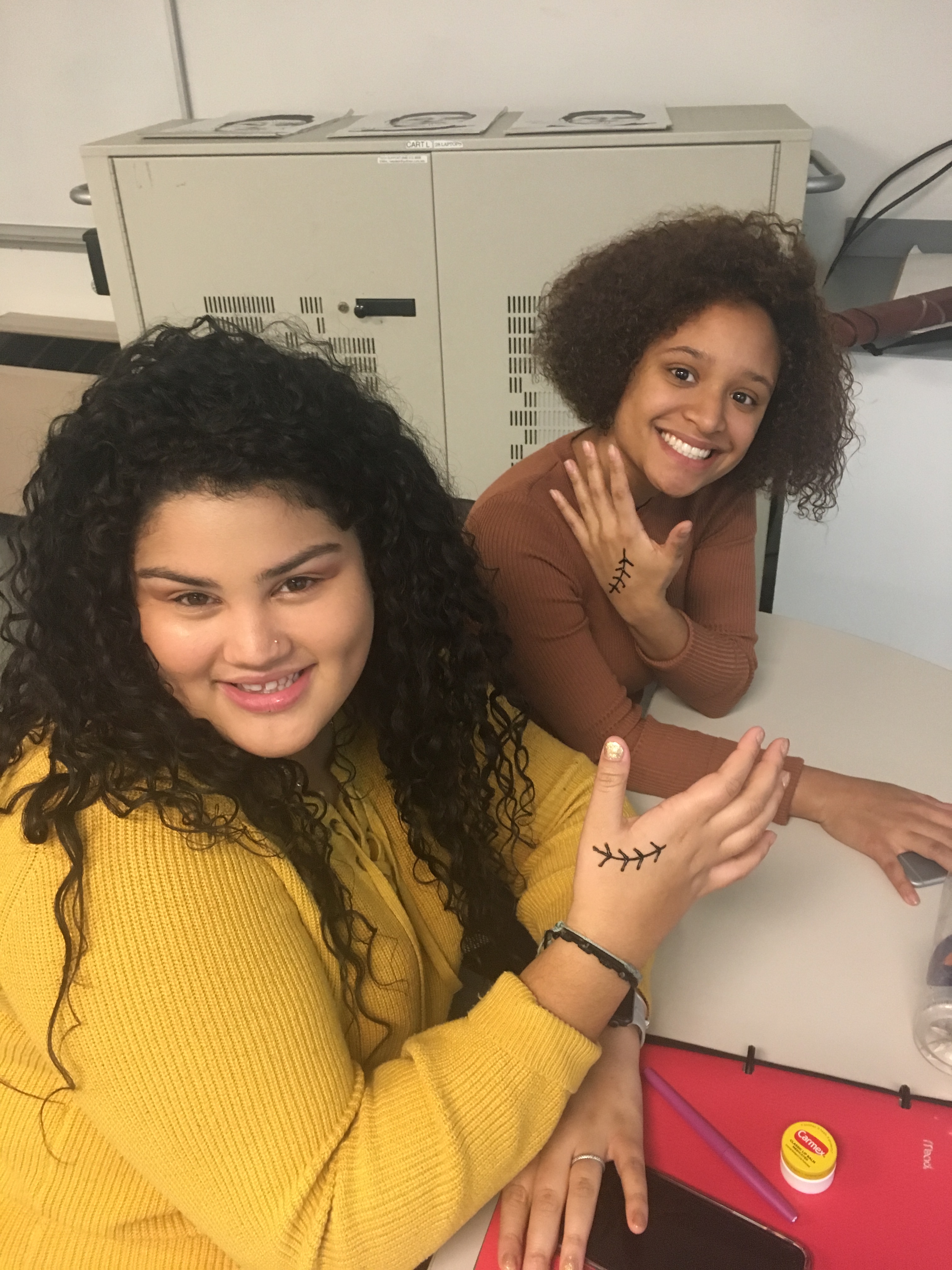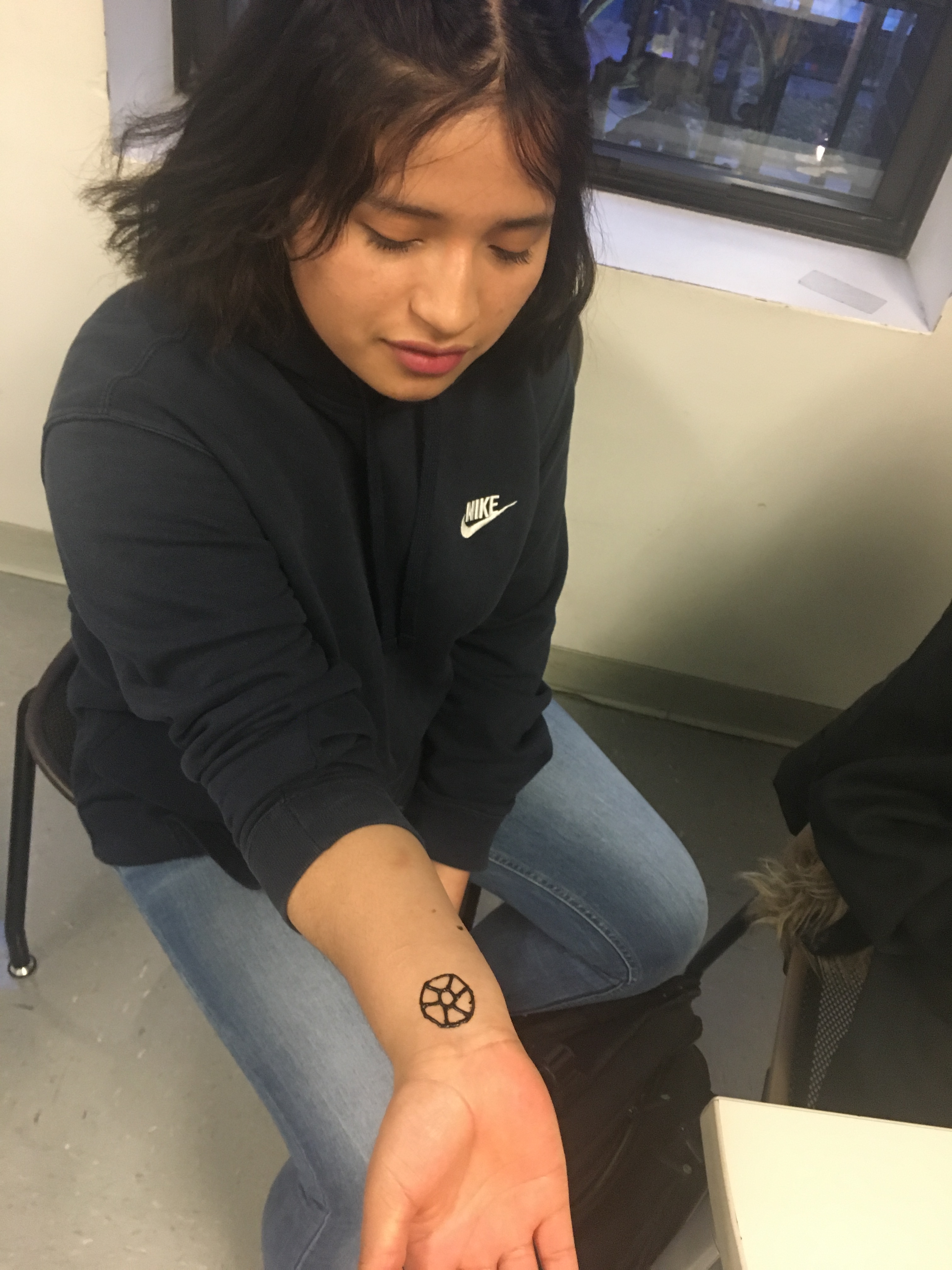 What students don’t love tattooing right now? I met Holly Nordlum through my friend Tonio Nguyen when I took students to Anchorage, Alaska (for more info on this trip, go here). One of our students was studying tattooing in youth culture between NYC and Anchorage, and Tonio set up a morning with Holly to learn about Indigenous tattooing and for her to do henna tattoos on the students. When I heard she was coming to NYC to participate in an Indigenous Arts Festival, I reached out and she was able to come to our Arts in NYC classes (compensated, of course). She talked to us about indigenous tattooing, why the word eskimo is = the n-word (don’t say it), women and community, and henna-tattooed the students. After class she gave me a real stick-and-poke tattoo on my arm, and about a dozen students stayed to watch.